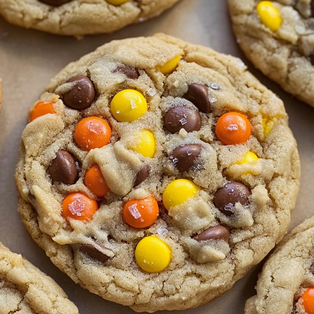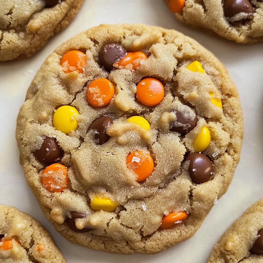 These cookies are a delightful mix of creamy peanut butter, sweet chocolate candy, and rich peanut butter chips, creating a flavor explosion in every bite.
